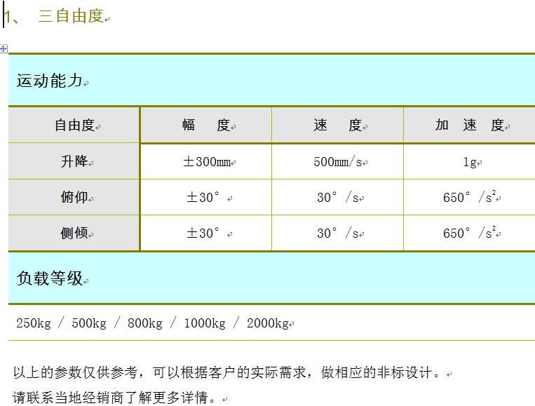 上海冀望在平臺的開發(fā)、設計的過程中積累了大量的實際應用技術和經(jīng)驗,具備很強的客戶化設計能力,可以根據(jù)您的不同要求,進行合理設計,優(yōu)化參數(shù),提供不同特性參數(shù)的2/3/4/5/6/7自由度平臺,并為您提供細致周到的技術咨詢和完善的售后服務。